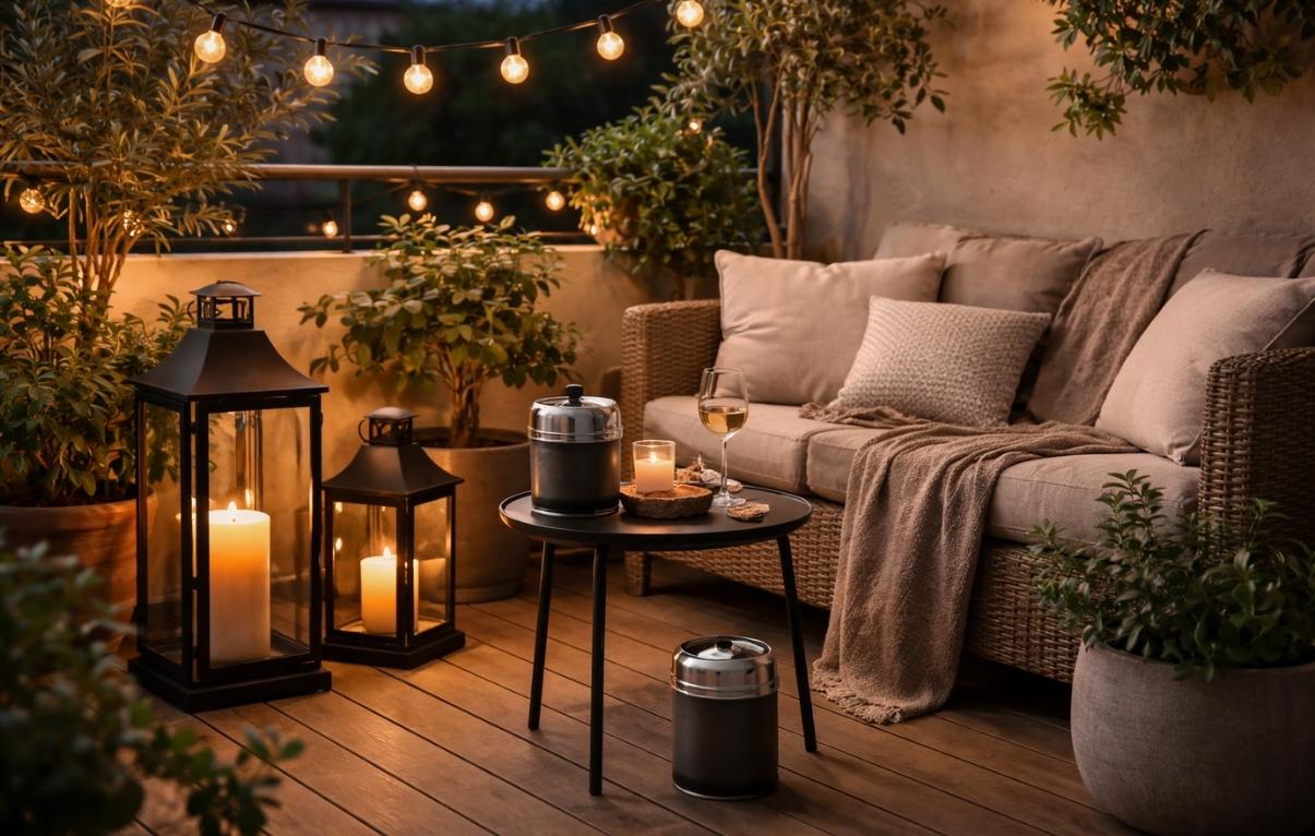 Associez vos lanternes avec des textiles doux comme des coussins ou un petit tapis extérieur pour renforcer le côté chaleureux. Pensez aussi à garder un coin dégagé pour circuler facilement et profiter pleinement de votre espace.